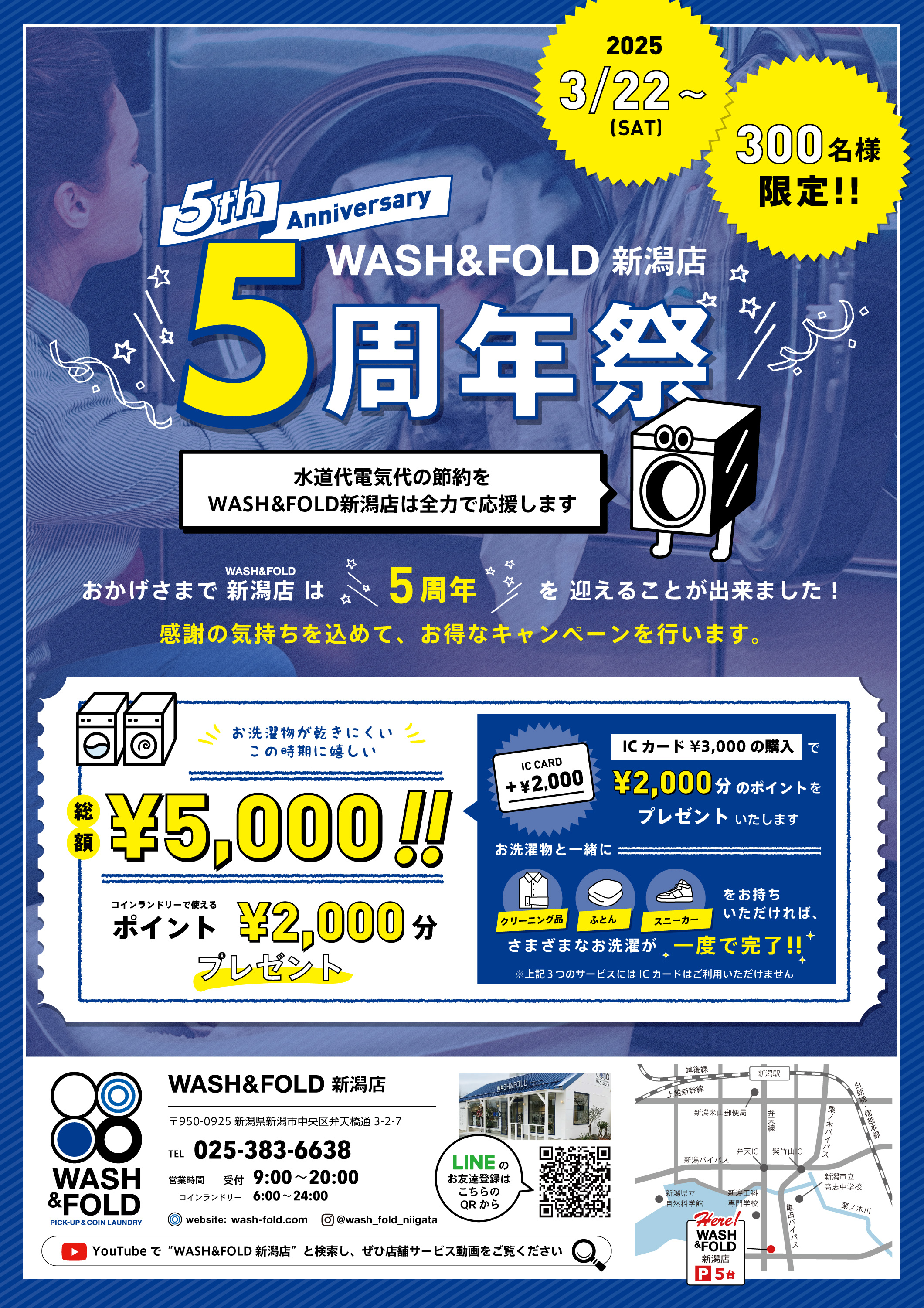 2025年3月22日(土)より「5周年祭」が開始になります。ICカード3000円購入でコインランドリーで使えるポイント2000円分プレゼント!