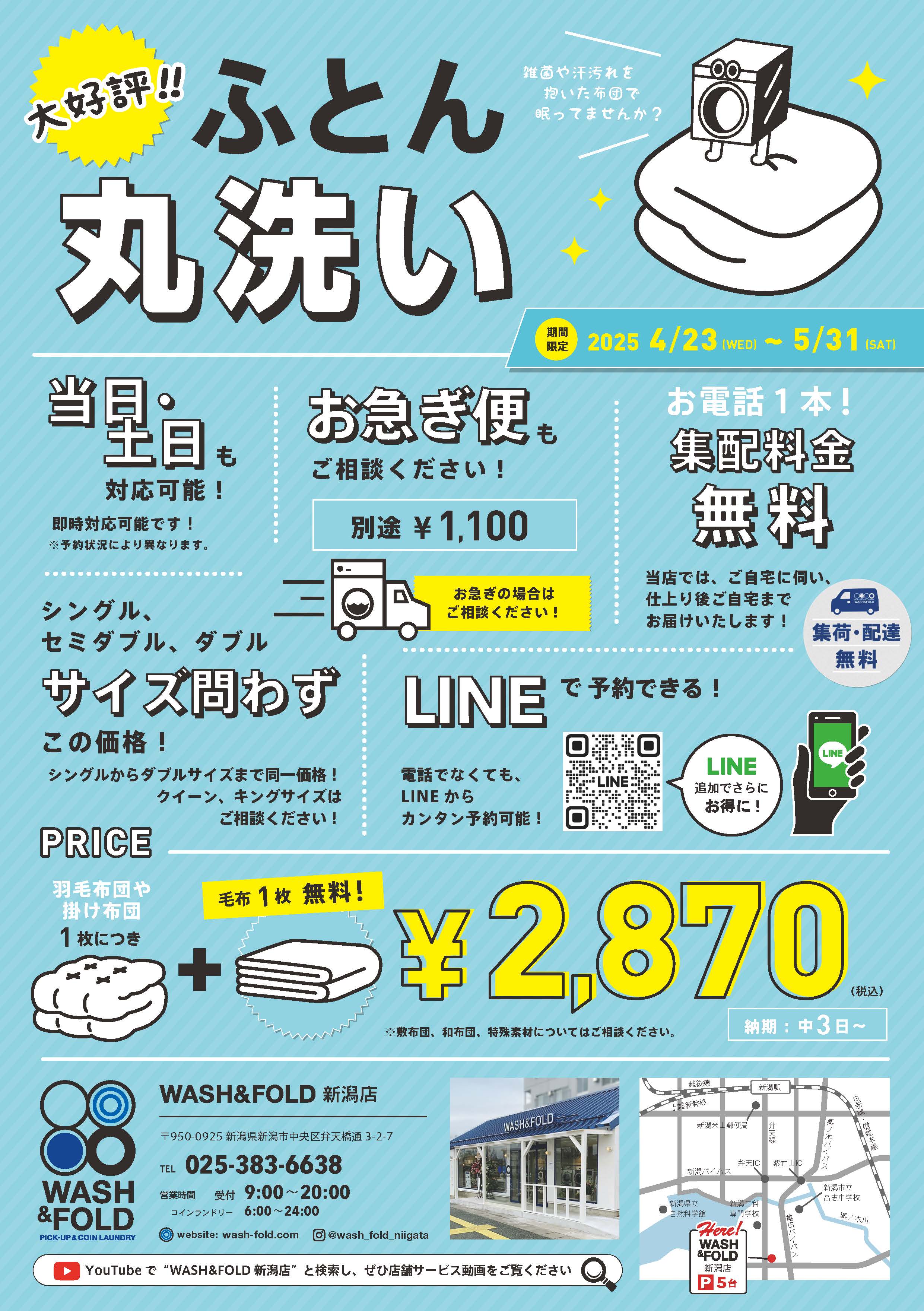 この度、新しくコインランドリー&洗濯代行サービスのWASH&FOLD新潟店のホームページが完成しましたので是非ご覧ください。